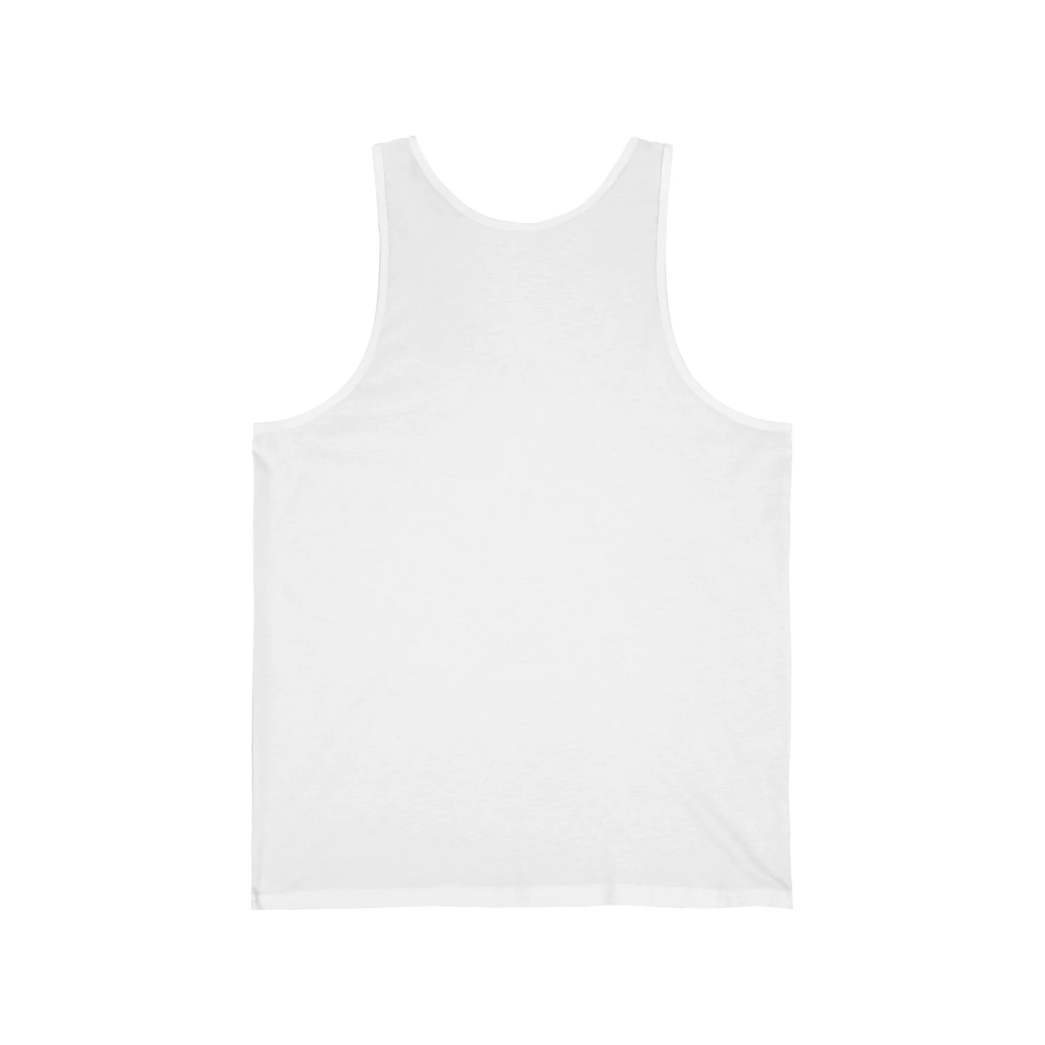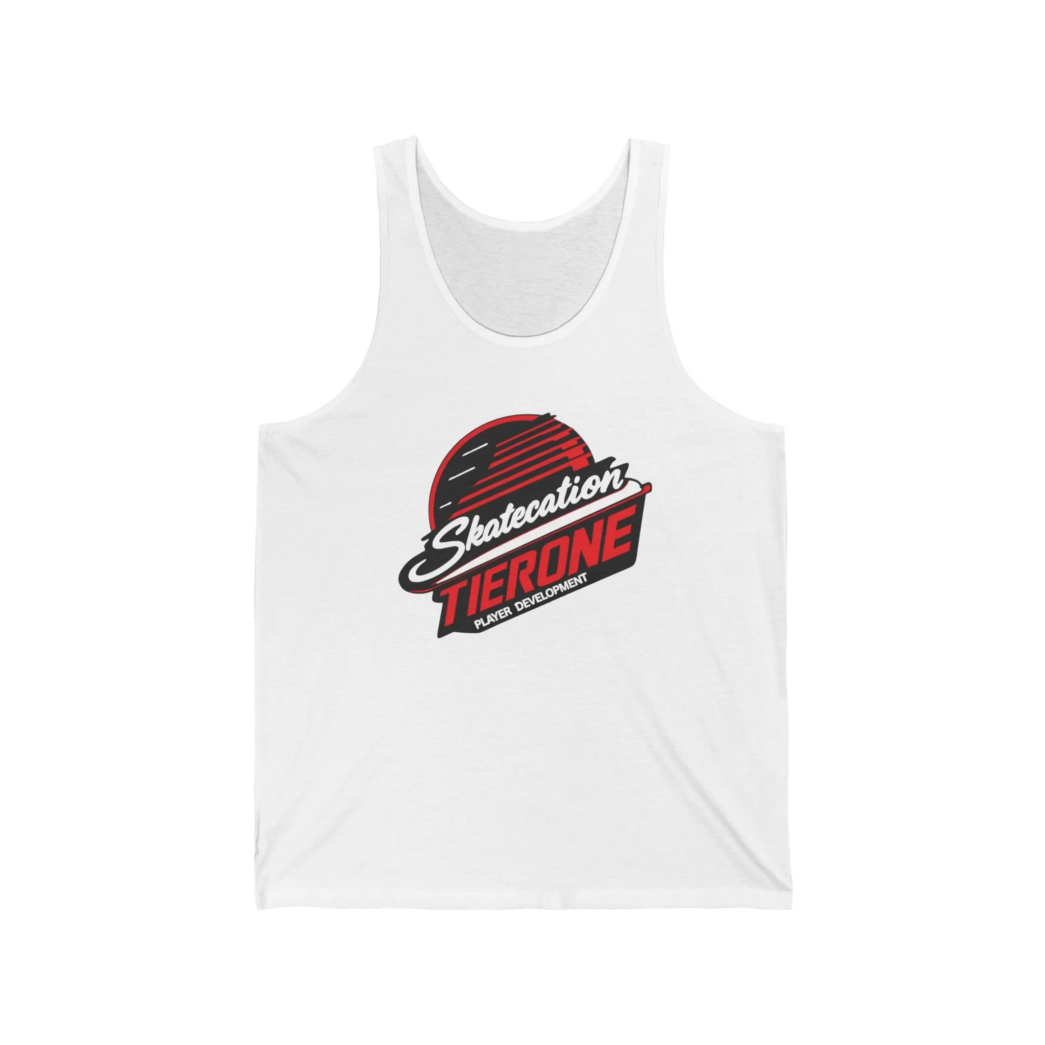 This lightweight jersey tank carries a vintage skate-club energy with a bold red-and-black crest printed on soft white fabric.